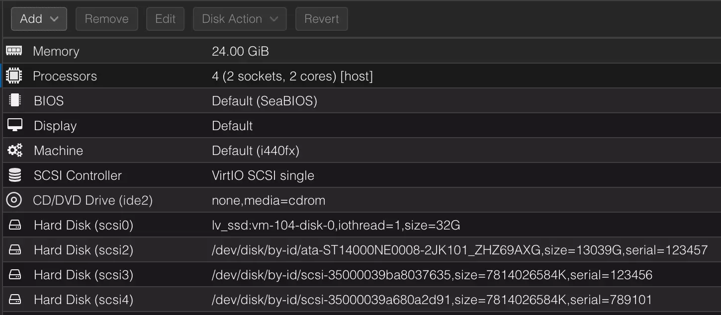 scsi<disk_number>: /dev/disk/by-id/<disk_id>,serial=<serial>,size=<disk_size>