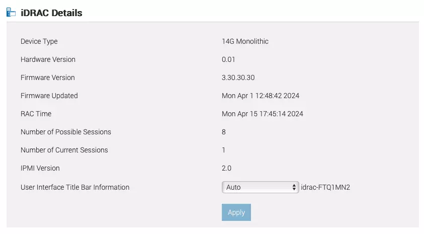 For this whole setup to work, iDRAC needs to be on firmware 3.30.30.30, as later firmware revisions remove the ability to control the fan speed. The firmware can be downloaded from Dell’s website. To downgrade, navigate to your iDRAC’s web admin page, and under Maintenance->System Update you can apply the downgrade. After the downgrade, make sure IPMI over LAN is enabled under iDRAC Settings->Connectivity->Network->IPMI Settings.