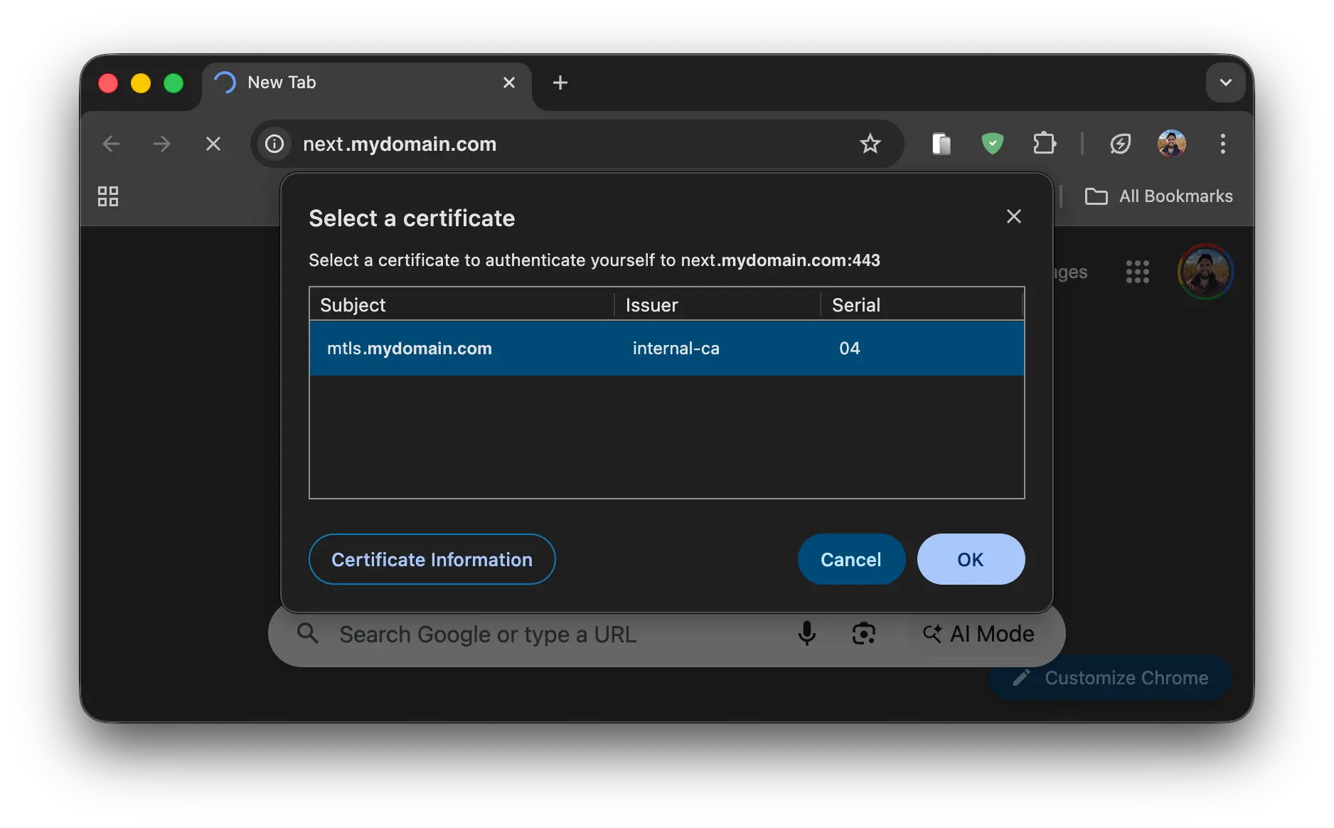 Copy the exported certificate to your client devices and install it. Then, navigate to the protected frontend and it should prompt a certificate selection like the cover image in this blog post. If no certificates are available, it means that the certificate was not installed properly.