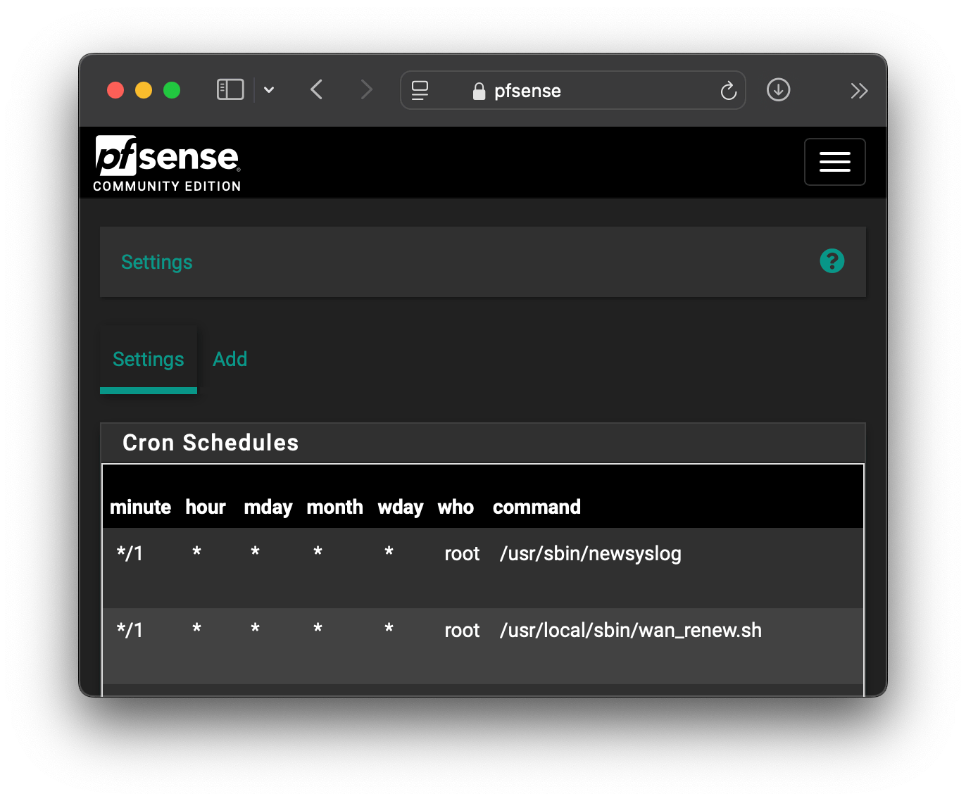 Ensure the cron package installed. Navigate to Services->Cron and click on Add. Set the settings as shown in the cover picture at the top of this page.